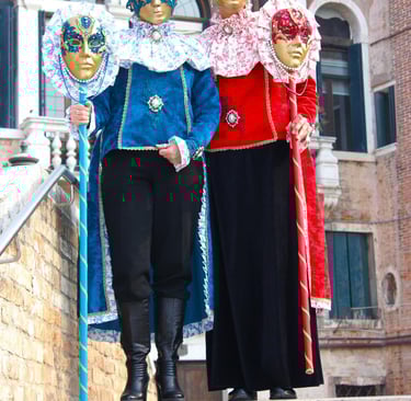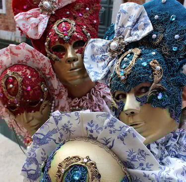 Venise, déjà fascinante par ses canaux et son architecture chargée d’histoire, devient durant le Carnaval un tableau vivant. Les costumes somptueux, ornés de broderies, de plumes et de pierreries, rappellent les portraits des grands peintres vénitiens comme Titien ou Véronèse. Chaque masque, avec ses motifs subtils et ses couleurs vibrantes, raconte une histoire. Pour un artiste, c’est un déferlement d’idées : comment capturer cette richesse visuelle dans une œuvre, qu’elle soit picturale, photographique ou sculpturale ?